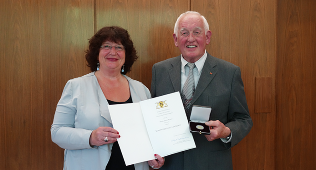 Für sein großes Engagement für die Inklusion von Menschen mit Behinderungen hat Albert Warth von Staatssekretärin Bärbl Mielich die Staufermedaille überreicht bekommen.