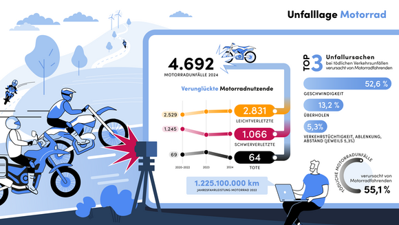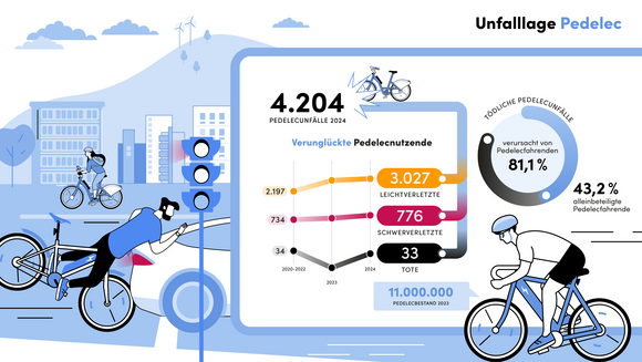 Fahrräder, ob mit Muskelkraft angetrieben oder Pedelecs mit elektronischer Unterstützung, sind weiterhin beliebte Fortbewegungsmittel in allen Altersschichten. Der Bestand wächst kontinuierlich und statistisch verfügt nahezu jede Person in Deutschland über ein Fahrrad oder Pedelec. Die Gesamtzahl der Fahrradunfälle (einschließlich Pedelecs) ging im Jahr 2024 auf 12.343 Fälle zurück (2023: 12.648; minus 2,4 Prozent); 57 Fahrradfahrerinnen und Fahrradfahrer verunglückten tödlich – fünf weniger als 2023 (2023: 62). 1.818 Radlerinnen und Radler verunglückten schwer – 58 weniger als im Vorjahr. Bei rund jedem dritten Fahrradunfall war ein Pedelec beteiligt (4.204). Insgesamt verletzten sich 776 Pedelecfahrerinnen und Pedelecfahrer schwer; von den 57 getöteten Fahrradfahrerinnen und Fahrradfahrern waren 33 mit einem Pedelec unterwegs. Damit endeten Pedelecunfälle mit Personenschaden häufiger tödlich als solche mit Fahrrädern ohne Motor. 32 der getöteten Fahrradfahrerinnen und Fahrradfahrern waren 65 Jahre oder älter.