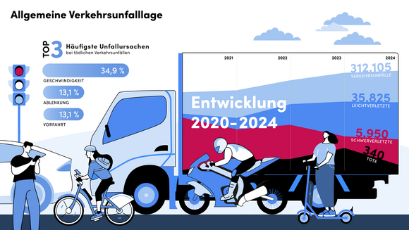 Im Jahr 2024 ereigneten sich in Baden-Württemberg insgesamt 312.105 Verkehrsunfälle; 3.508 mehr als im Vorjahr (plus 1,1 Prozent). Bei 89 Prozent der Verkehrsunfälle blieb es bei Sachschäden (278.631; plus 1,3 Prozent). Insgesamt wurden 42.115 Personen verletzt (2023: 42.598; minus 1,1 Prozent). Sowohl bei den Leichtverletzten (35.825; minus 0,7 Prozent) als auch bei den Schwerverletzten (5.950; minus 3,1 Prozent) sind Rückgänge zu verzeichnen. 340 Menschen kamen im Jahr 2024 bei Verkehrsunfällen ums Leben, 29 weniger als 2023 (minus 7,9 Prozent). Der Anteil der Verkehrsunfälle mit Personenschaden am Gesamtunfallaufkommen wird immer geringer. Während im Jahr 2010 bei 12,3 Prozent der Verkehrsunfälle Personen zu Schaden kamen und im Jahr 2023 bei 10,9 Prozent, waren es 2024 nur noch 10,8 Prozent.