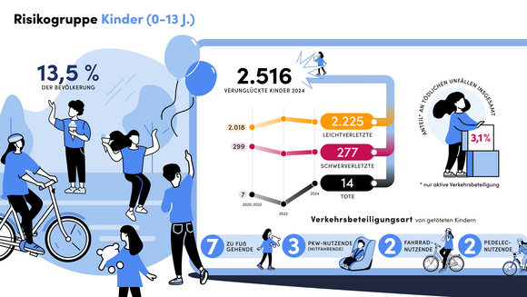 Nach einem absoluten Tiefstand im Jahr 2023 (ein Kind), kamen im vergangenen Jahr 14 Kinder (0 bis 13 Jahre) auf Baden-Württembergs Straßen ums Leben. Insgesamt war ein Rückgang der Verkehrsunfälle mit Beteiligung von Kindern von 1.805 auf 1.739 (minus 3,7 Prozent) festzustellen. 2.516 Kinder wurden bei Verkehrsunfällen verletzt, 113 weniger als im Vorjahr (minus 4,3 Prozent). Auf dem Schulweg ereigneten sich 378 Unfälle (2023: 423, minus 10,6 Prozent), bei denen die Kinder selbstaktiv unterwegs waren.