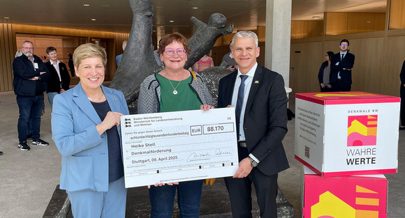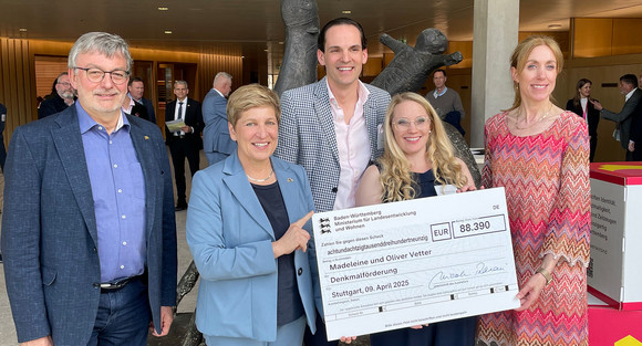 Die Ministerin für Landesentwicklung und Wohnen, Nicole Razavi, überreichte im Stuttgarter Landtag symbolische Schecks an fünf Denkmaleigentümerinnen und -eigentümer aus Baden-Württemberg. Das Land unterstützt sie bei der Sanierung ihrer Kulturdenkmale jeweils mit einer Förderung im Rahmen der ersten Tranche des Denkmalförderprogramms 2025.