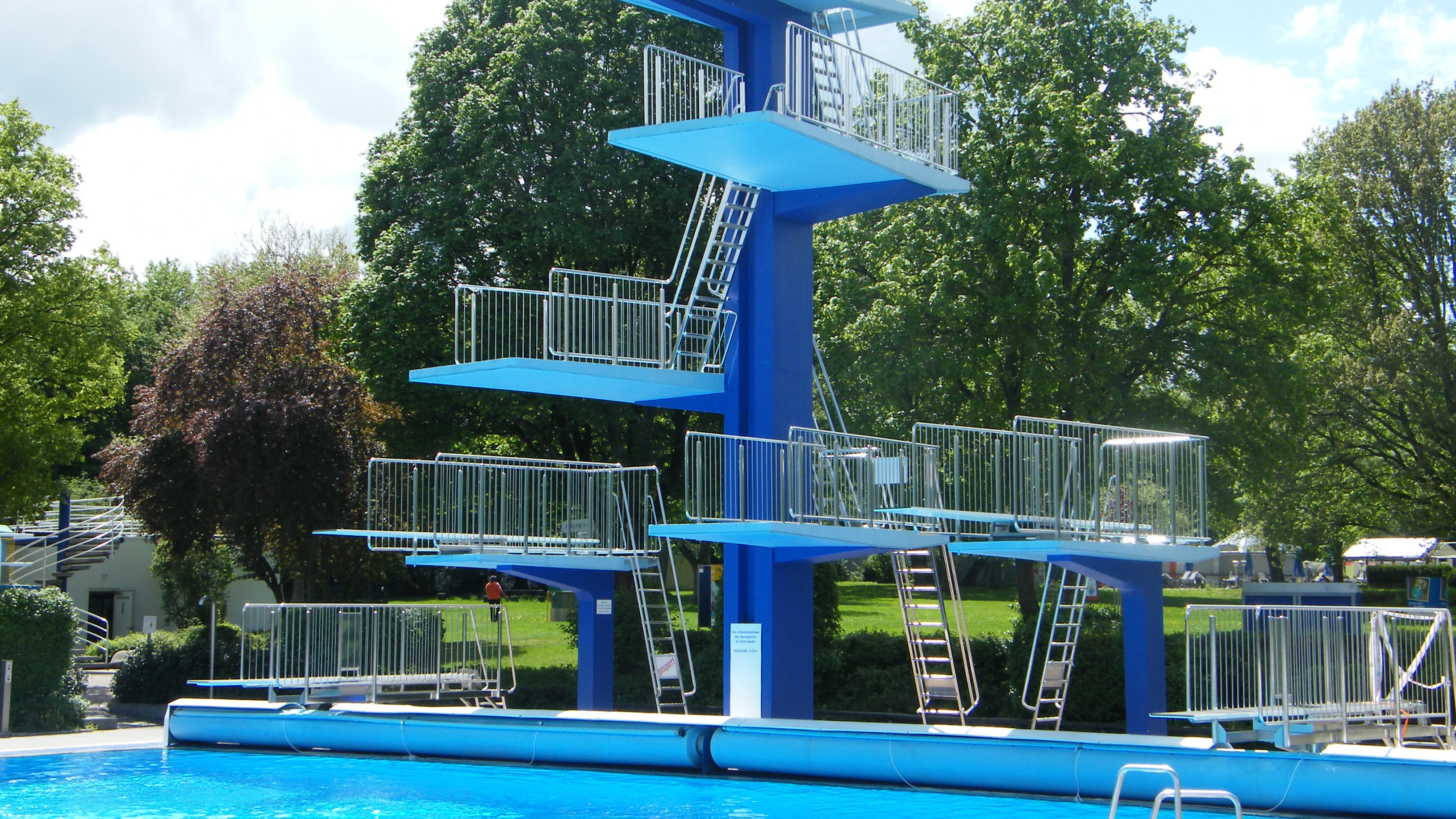 Das Schwimmerbecken mit 21 mal 50 Metern, daneben das Sprungbecken mit 21 mal 25 Metern und einer Wassertiefe von viereinhalb Metern sowie die parallel dazu angebrachte Zuschauertribüne mit dahinterliegenden Kabinen bilden das Kernstück der Anlage. Einen besonderen Akzent setzte von Anfang an die imposante Betonskulptur des zehn Meter hohen Sprungturms mit unterschiedlich hohen Plattformen. Ein weiteres architektonisches Meisterstück ist die kühn und leicht wirkende Konstruktion der an ihrer Rückseite unverkleideten Tribüne, auf deren Betonstufen 2.000 Zuschauer Platz finden.