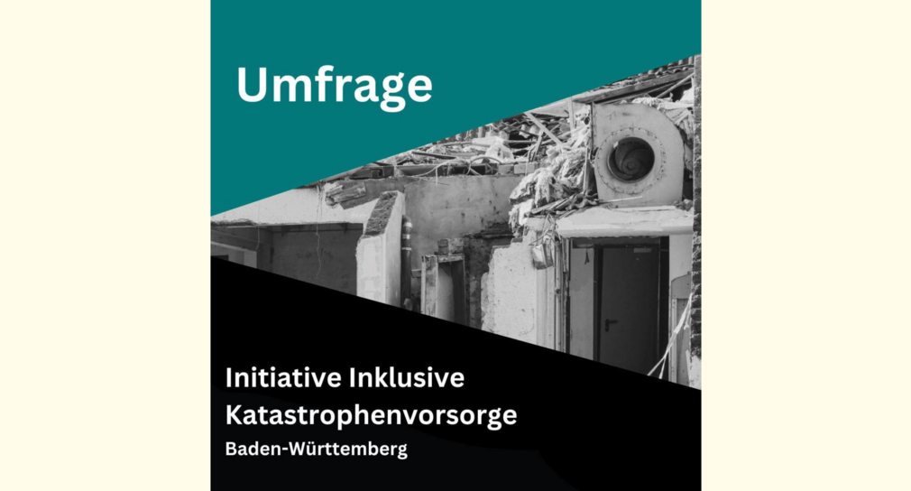 Bis zum 8. September 2024 läuft die Umfrage zum inklusiven Katastrophenmanagement in Baden-Württemberg. Die „Initiative Inklusive Katastrophenvorsorge Baden-Württemberg“ möchte so für mehr Sicherheit für alle in Baden-Württemberg sorgen.