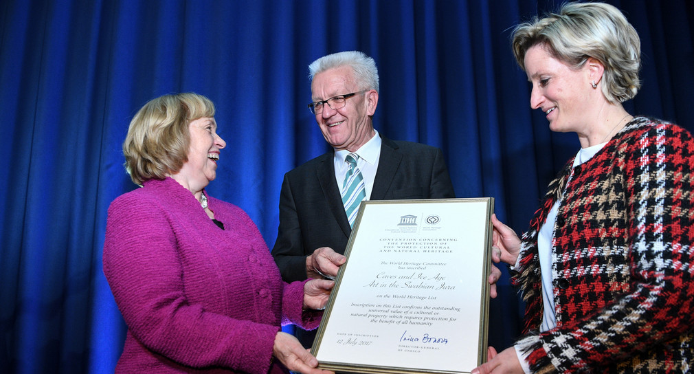 Die Staatsministerin im Auswärtigen Amt Prof. Dr. Maria Böhmer überreichte die Urkunde anlässlich der Aufnahme der „Höhlen und Eiszeitkunst der Schwäbischen Alb“ in die UNESCO-Welterbeliste an Ministerpräsident Winfried Kretschmann und Wirtschaftsministerin Nicole Hoffmeister-Kraut. „Es ist nicht zu viel gesagt, wenn man die Schwäbische Alb als Wiege der Menschheit, als Wiege von Kunst und Kultur bezeichnet. Und es ist daher nur folgerichtig, dass die Fundstätten und die sie umgebende Landschaft nun von der UNESCO zum Welterbe erklärt wurden“, sagte Ministerpräsident Winfried Kretschmann beim Festakt in Ulm. „Mit der Verleihung geht aber auch eine Verpflichtung einher, die Welterbestätte zu schützen, zu pflegen und die Vermittlung dieser frühen Epoche der Menschheitsgeschichte zu stärken.“ Dieser Verpflichtung sei sich das Land gemeinsam mit der Region, dem Alb-Donau-Kreis, dem Landkreis Heidenheim und den Kommunen vor Ort bewusst. Der Titel sei auch eine besondere Auszeichnung und Würdigung der jahrzehntelangen archäologischen und paläontologischen Forschung im Land.