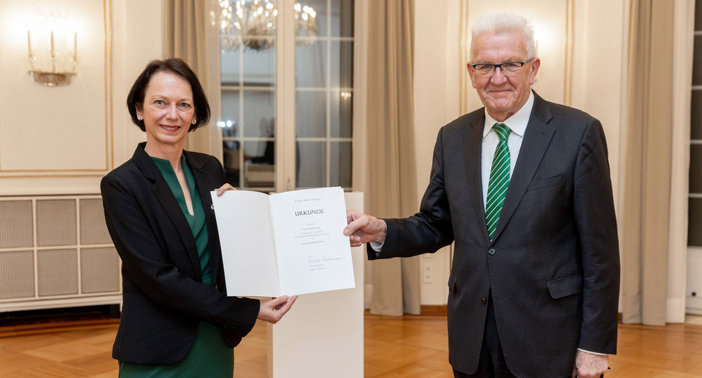 Ministerpräsident Winfried Kretschmann hat der neuen Regierungspräsidentin des Regierungsbezirks Stuttgart, Susanne Bay, ihre Ernennungsurkunde übergeben.