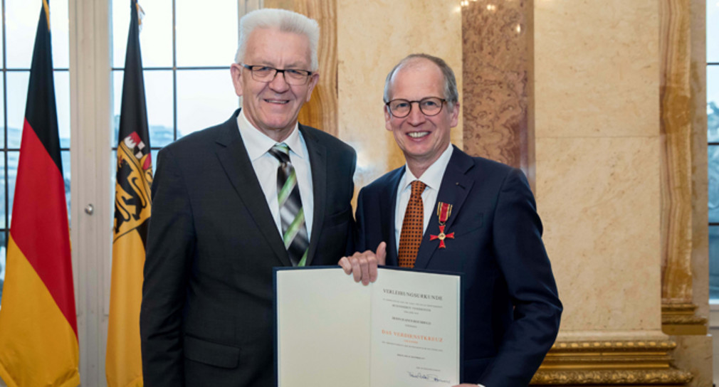 Ministerpräsident Winfried Kretschmann hat Rainer Reichhold das Verdienstkreuz am Bande des Verdienstordens der Bundesrepublik Deutschland überreicht und dessen herausragendes Engagement für das Handwerk im Land gewürdigt.