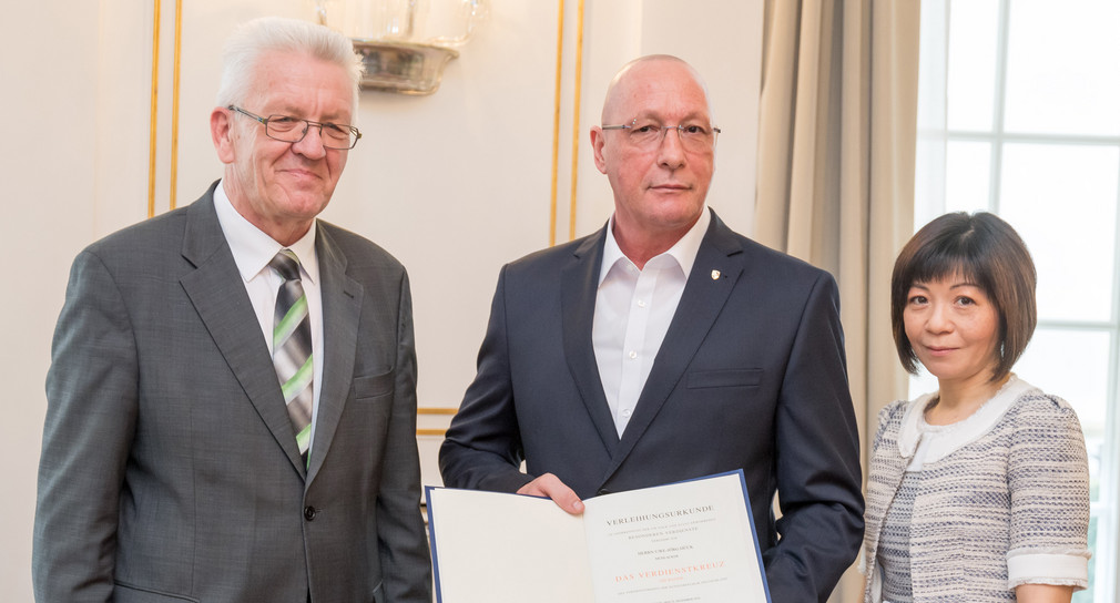 Ministerpräsident Winfried Kretschmann hat Uwe Hück das Bundesverdienstkreuz am Bande überreicht. Kretschmann lobte Hücks Einsatz für mehr soziale Gerechtigkeit und Chancengleichheit.