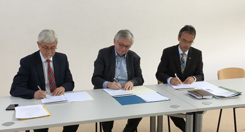 Oberbürgermeister Karl Hilsenbek, Landrat Klaus Pavel und Staatssekretär Julian Würtenberger haben einen Vertrag zum Weiterbetrieb der Landeserstaufnahmeeinrichtung in Ellwangen unterschrieben.