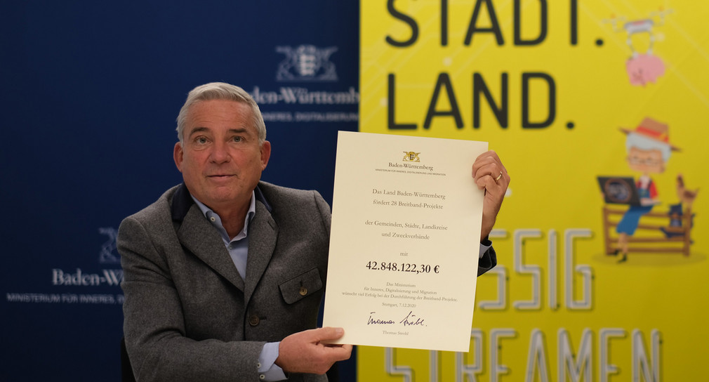 Digitalisierungsminister Thomas Strobl hat Breitbandförderbescheide über rund 42,8 Millionen Euro übergeben. Gefördert werden weitere 28 Breitbandprojekte in zwölf Landkreisen. Damit hat das Land im Jahr 2020 insgesamt 427,5 Millionen Euro Fördermittel für 488 Projekte bewilligt.