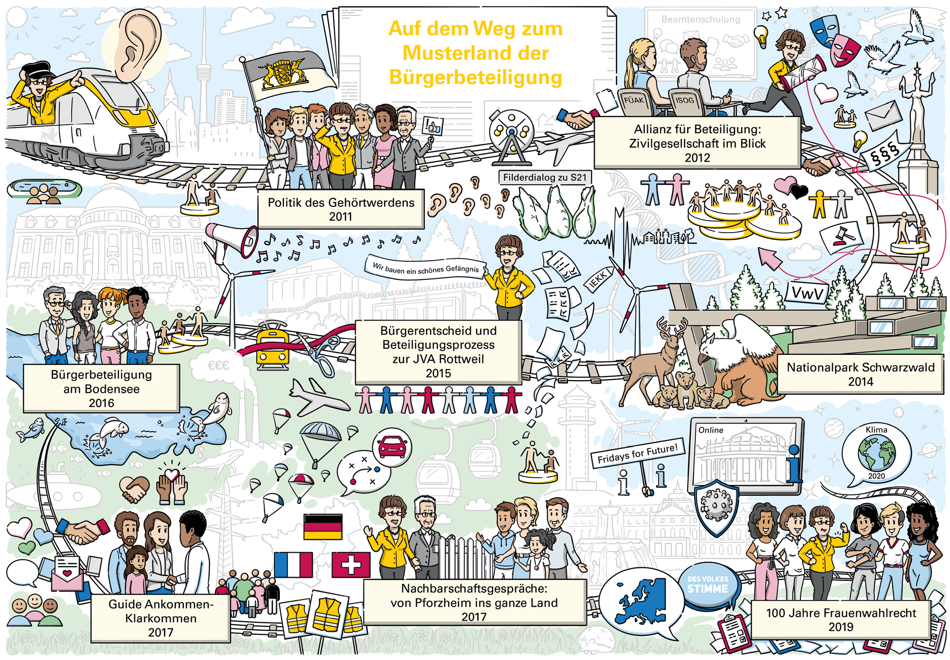 Auf einem Wimmelbild wird der Weg Baden-Württembergs zum Musterland der Bürgerbeteiligung grafisch dargestellt.
